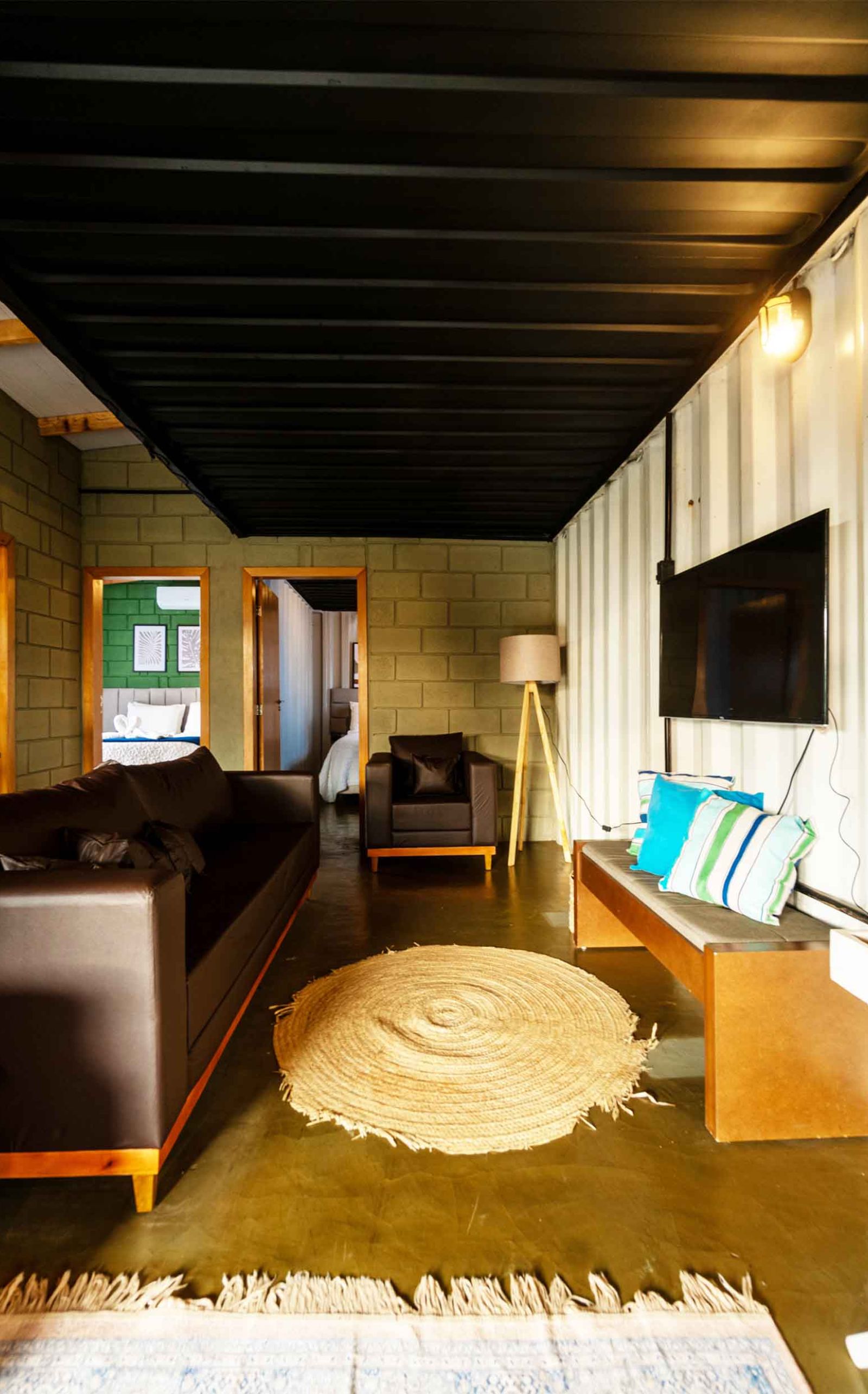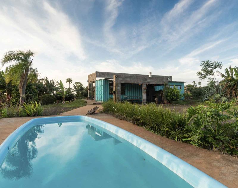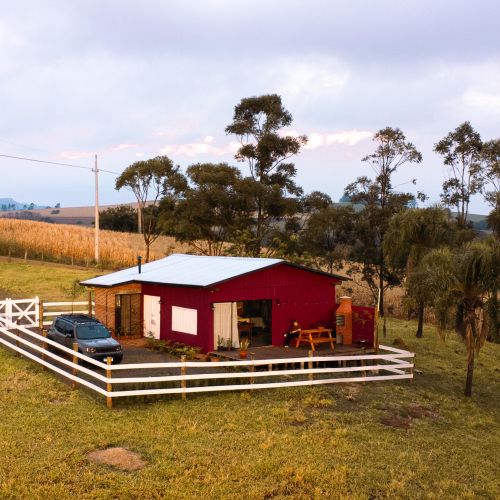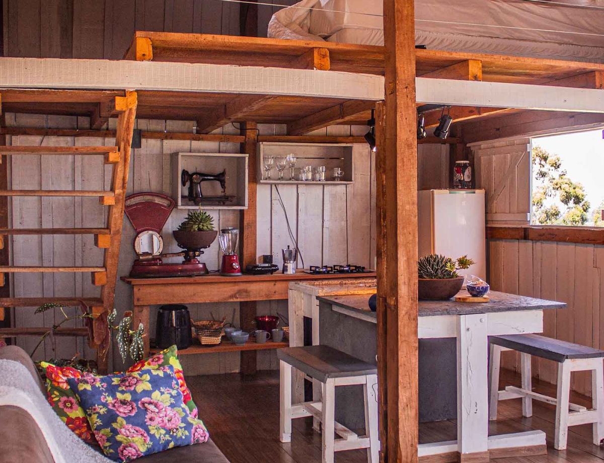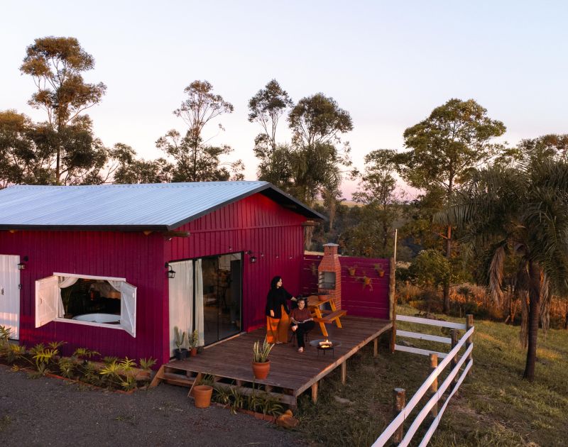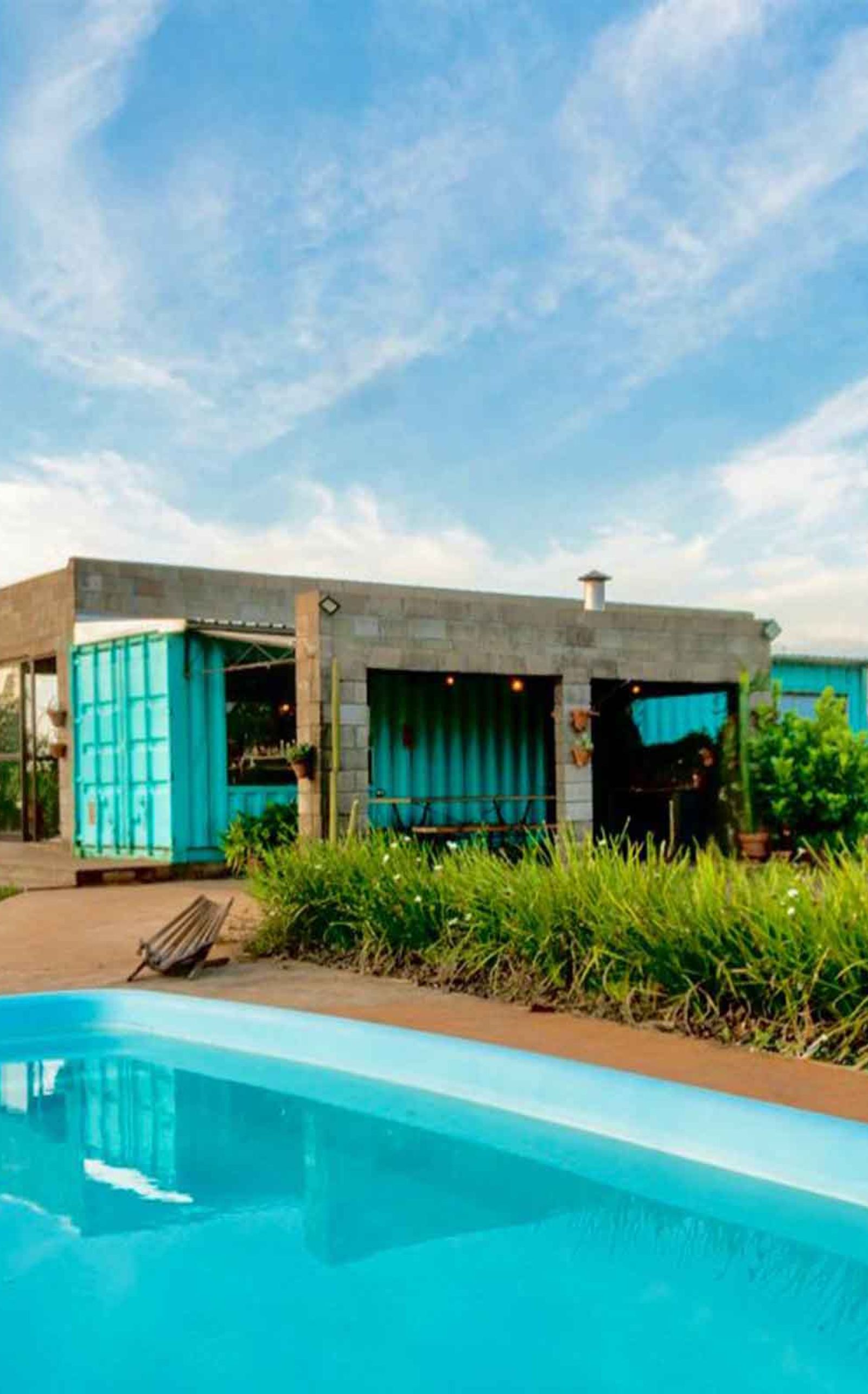 Casa Container acomoda até 4 pessoas, Cabana Tulha 2 pessoas, e Cabana Celeiro 2 pessoas.